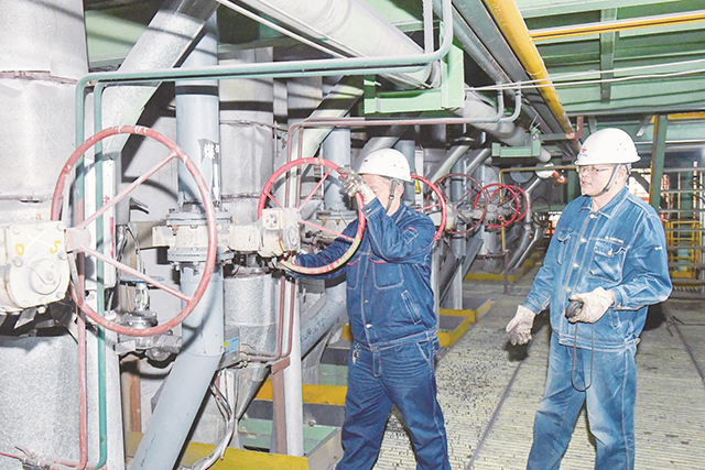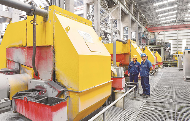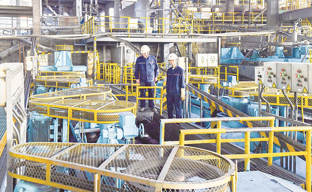 10月15日,礦業公司選礦分公司粗選作業區職工楊國林與陳義千(左)正在查看精礦質量。今年以來,該分公司嚴格按照高質量、高品位的原則組織生產,狠抓生產工藝和工序操作管理,進一步加強質量監督檢查,增強質量保證能力,提供優質產品,沖刺全年奮斗目標。